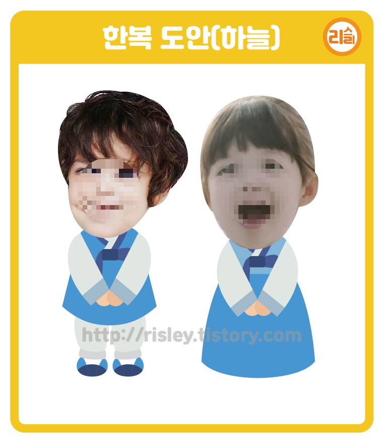 추석 때 공유해드린 한복 도안보다 단순하고 귀여운 느낌이 드는 한복 합성 도안이에요.😍 우리 아이들 얼굴을 합성해주면 정말정말 귀엽겠죠? 한, 두 가지 색상 도안만 공유해드리기는 아쉬운 마음이 들어서 만들다보니 6종 한복 도안 세트가 되었어요.