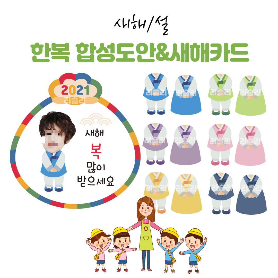색조합에 약한 편이라 남녀 한복은 동일한 색으로 통일했답니다. 다양한 종류의 한복 합성 도안을 준비했으니 골고루 합성하여 교실 환경구성, 연하장, 새해카드 등에 활용해보세요!