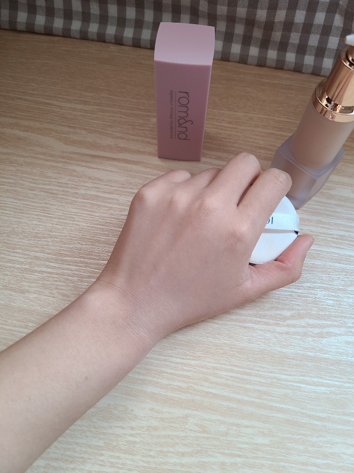 손등에 한 번 펌핑해보았어요. 롬앤 퍼펙트 핏팅 파운데이션 제형은 묽게 흐르는 제형이에요. 손등에 짜두면 금새 흘러서 적당량 펌핑하고, 바로 얼굴에 얹어 주는 것이 좋아요~