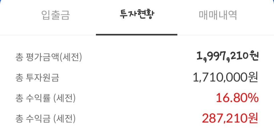 8개월간의 투자 원금은 170만원. 수익률은 16.8%로 28만원의 수익금을 얻었습니다. 1%대 금리와 비교하여 투자하는 보람이 쏠쏠합니다.💕 5년 이상 장기투자를 목표로 하기 때문에 변동하는 수익률에 크게 동요하지 않고 욕심부리지 않을 생각입니다.