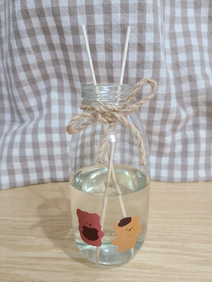 어쩐지 디퓨저가 너무 심심한 느낌이니까~ 귀여운 스티커와 노끈을 활용해서 심플하게 꾸며 주었어요. 재활용 공병을 내 스타일대로 리폼하는 것도 즐거운 재미 포인트💕