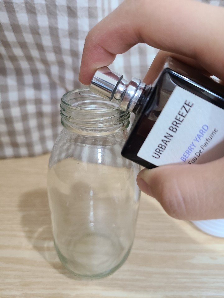 오래된 향수로 디퓨저 만들기는 적당한 비율로 취향것 섞기만 하면 되서, 정말정말 쉬워요!! 향수는 공기와의 접촉을 피하는 것이 중요하기 때문에 스프레이 입구가 붙어서 나오는 것이 대부분이죠~ 공구 도구를 이용해서 떼어낼 수 있지만 따로 도구가 없는 저는 손으로 열심히 뿌려줍니다.🤣 공병을 가로로 잡고 입구에 맞추어 뿌리면 빠르게(?) 옮길 수 있어요.