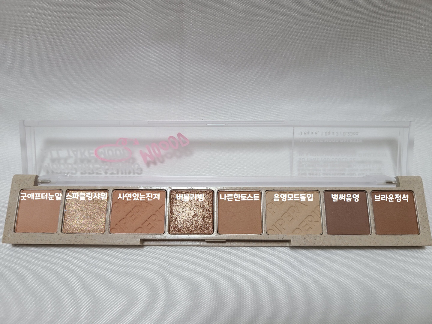 섀도우 팔레트의 경우 4구로 나오는 제품이 많은데 페리페라 올테이크 무드 팔레트는 저렴한 가격에 무려 8구로 구성되어 있어요. 페리페라는 상시 할인을 하기 때문에 할인가격에 구매하면 정말정말 혜자스러운 팔레트랍니다! 특이하게 4칸, 4칸의 사각팔레트로 구성된게 아니라 가로로 길게 일렬배열 되어 있어서 휴대성은 다소 떨어져요.