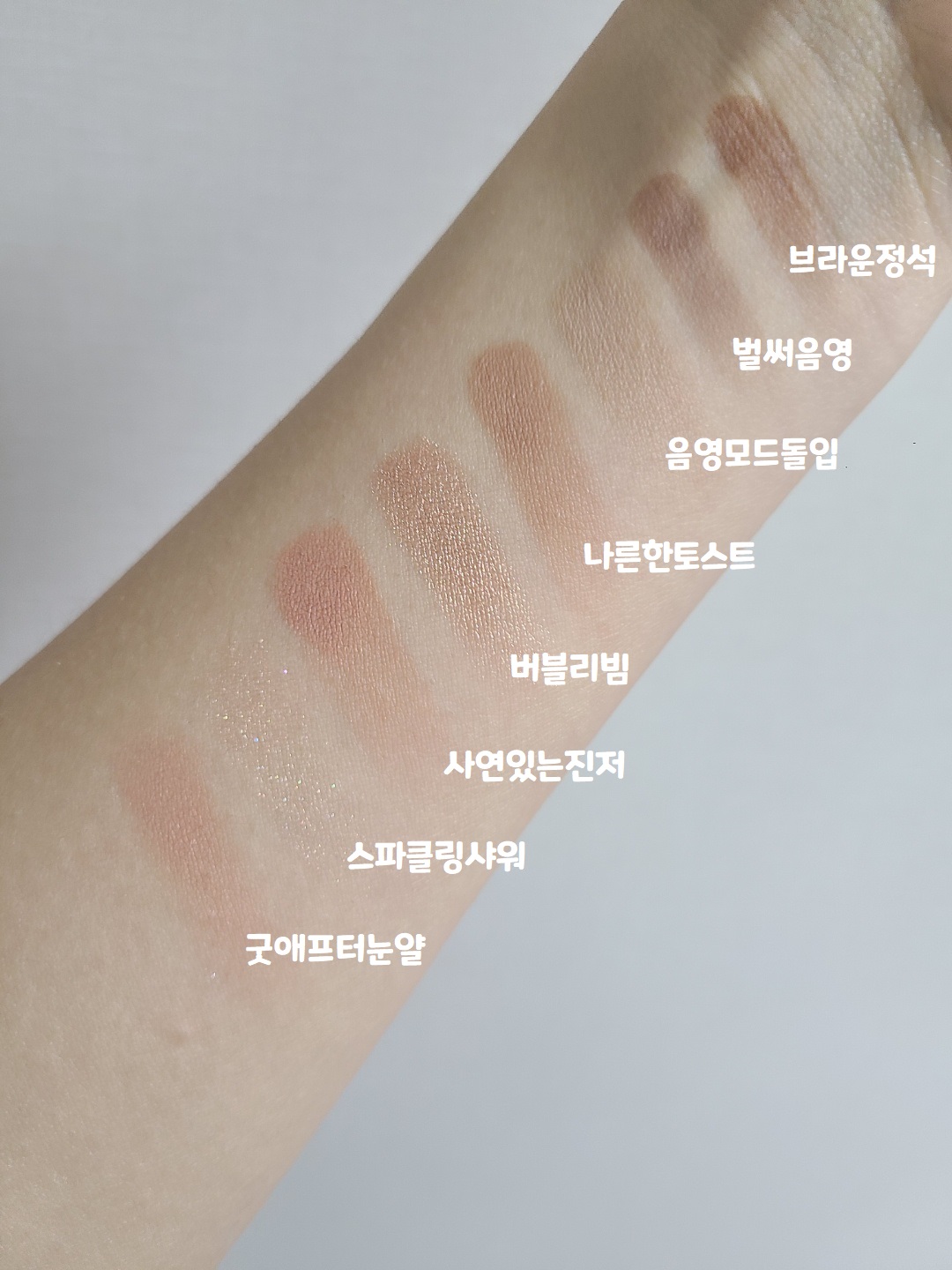 브라운 쉬머펄의 섀도우입니다. 스파클링샤워가 투명하게 발색된다면, 버블리빔은 브라운의 색감이 강해서 색감과 펄감을 함께 주고 싶을때 사용하면 좋을 것 같아요.