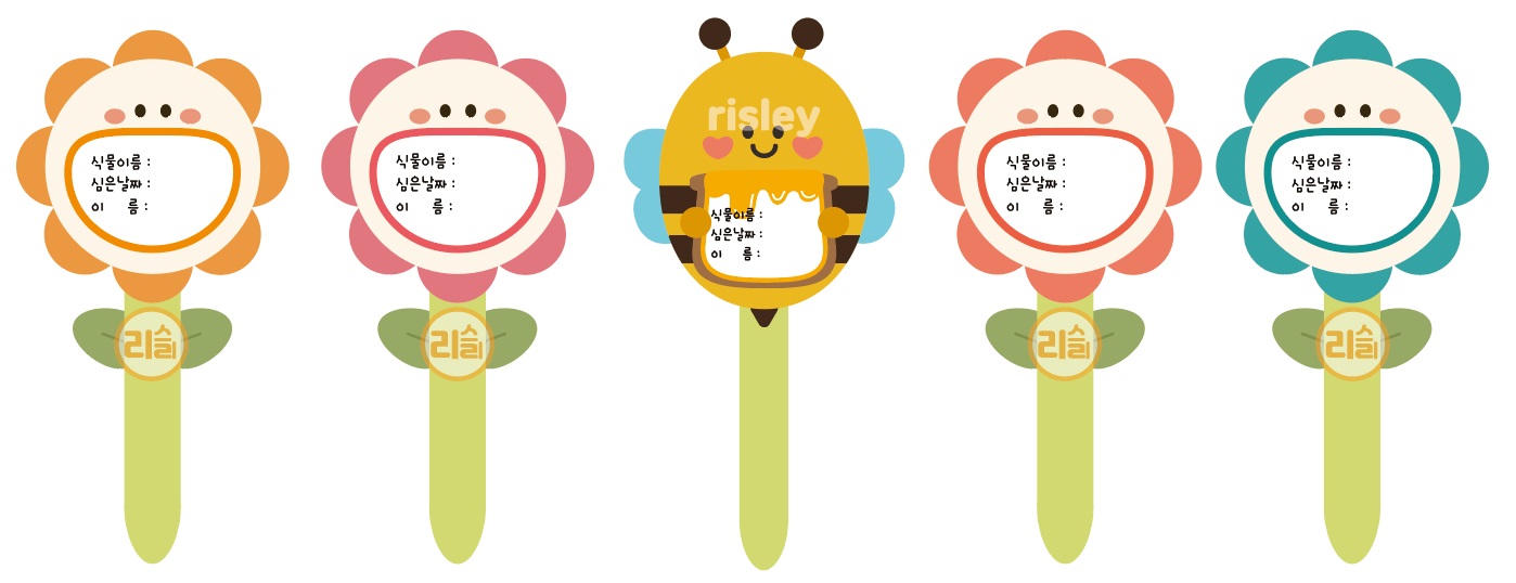 꽃 종류를 심는다면 '꿀벌 이름표'를 추천드려요. 아름답게 피어날 꽃을 기다리며 꿀벌이 날아왔다고 이야기해주면 아이들도 재미있어 할 것 같아요~ 선생님들이 예쁘게 활용해주실 모습이 기대가 됩니다!