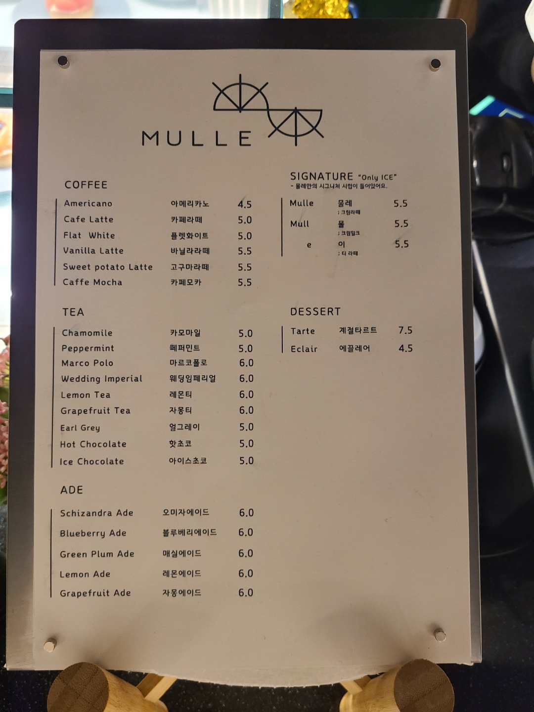 요즘 바닐라라떼에 푹 빠진 저는 바닐라라떼를 주문했어요. 후식으로 상큼한 에이드류를 먹을까 하다가 커피로 결정했는데, 다음에는 오미자 에이드를 먹어보고 싶어요! 주문 당시에는 몰랐는데 다시보니 물레만의 시그니쳐 메뉴도 있었네요. 시그니쳐 시럽이 들어간 크림라떼, 크림밀크, 티 라떼. Mulle의 Mull과 e를 메뉴 명칭으로 기획했다는 점이 신박해요~ 주문할때 "이 주세요"하면 되는걸까요? 😅😅