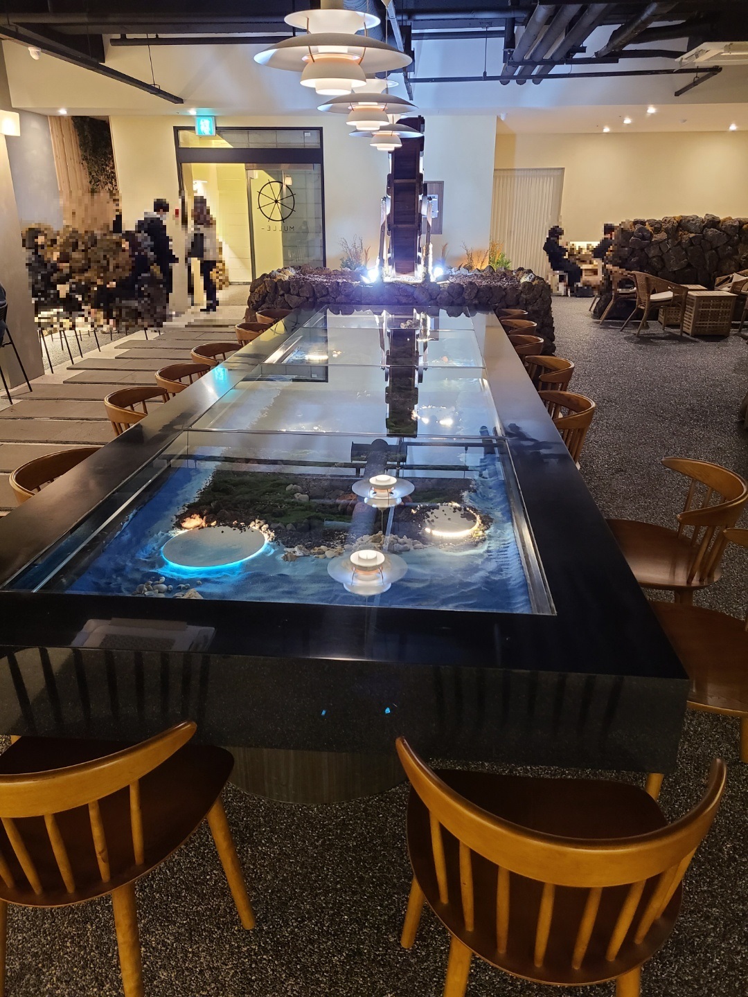 가장 넓직한 대형 테이블의 인테리어가 정말 독특하고 인상적이었어요! 제주도의 풍경을 간직한 테이블을 관찰하는 재미가 쏠쏠~ 은은한 조명이 더해져 더욱 멋스러웠어요. 혼자 방문하신 분들께서 이용하기 좋은 좌석인데 책을 읽거나 공부, 업무를 하기에는 전반적인 조명이 너무 어두워서 추천하지는 않아요!