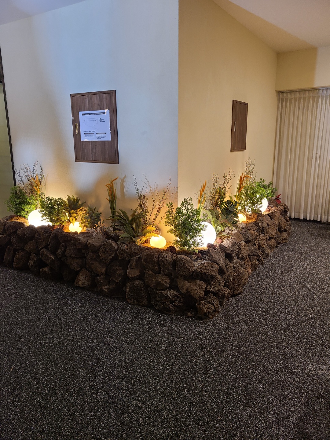 제주도를 느낄 수 있는 노원 카페 물레의 전경입니다. 아늑하고 따뜻한 제주도 감성을 느낄 수 있어요. 자갈 디테일의 바닥과 돌담, 갈대가 어우러져 마치 잠시 제주도로 여행을 떠난 듯한 느낌이 들어요~