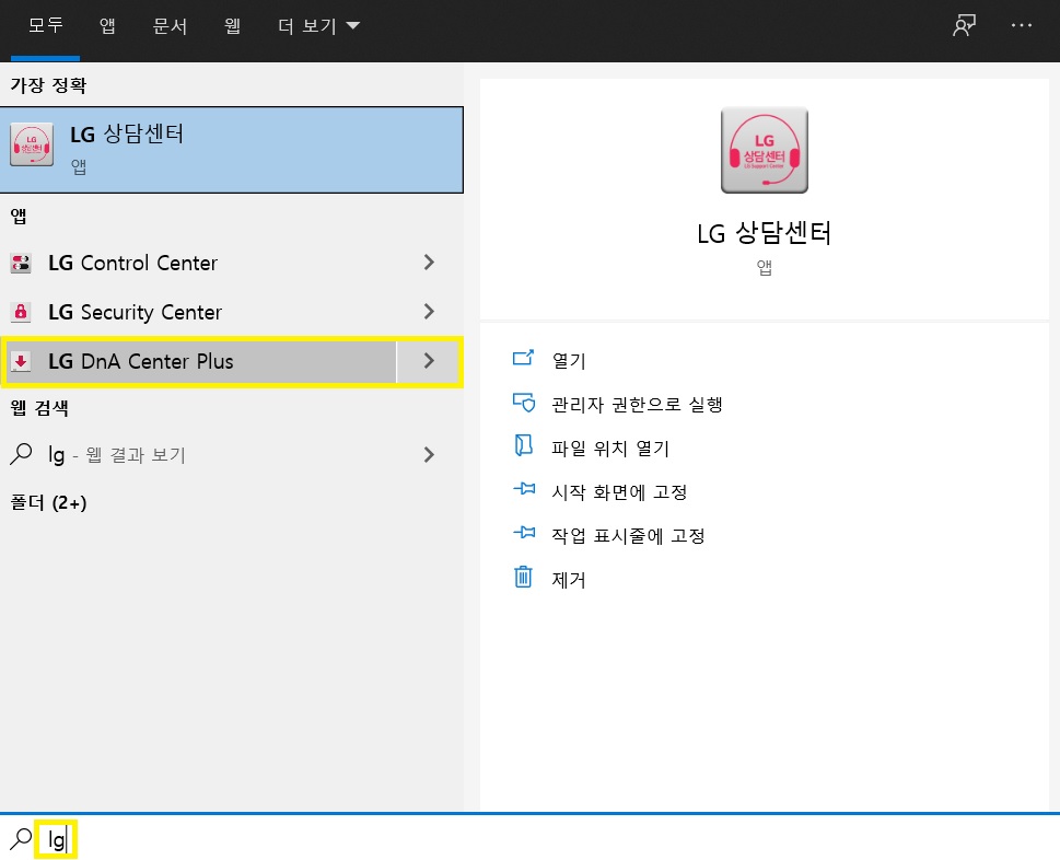 ③재부팅 후 LG DnA Cener plus를 실행해서 터치패드 드라이버를 재설치합니다. LG DNA는 운영체제 미탑재 노트북에 필요한 드라이버와 응용 프로그램을 설치해주는 역할을 합니다. 검색창에 lg등을 검색하면 찾을 수 있어요. 저는 DNA실행에 오류가 있어서(눌러도 실행되지 않음) 제어판에서 완전히 제거한 후, LG사이트에서 다시 다운받아 설치했어요.