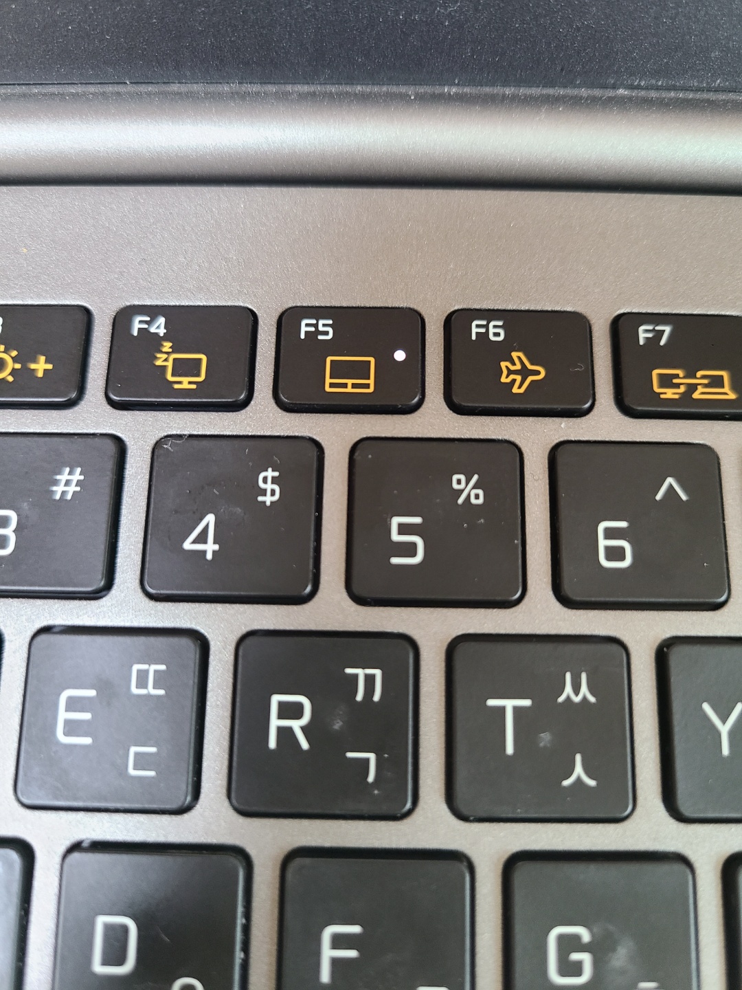 f5 불빛은 터치패드 기능 off상태일 때, 꺼져 있어야 정상인데 계속 켜져있는 자판 오류가 발생했어요.😂😂 fn+f5를 누르면 터치패드가 켜지고 꺼지는 기능 자체는 잘 작동하는데 불빛이 계속 켜져 있는 것이 문제였습니다.