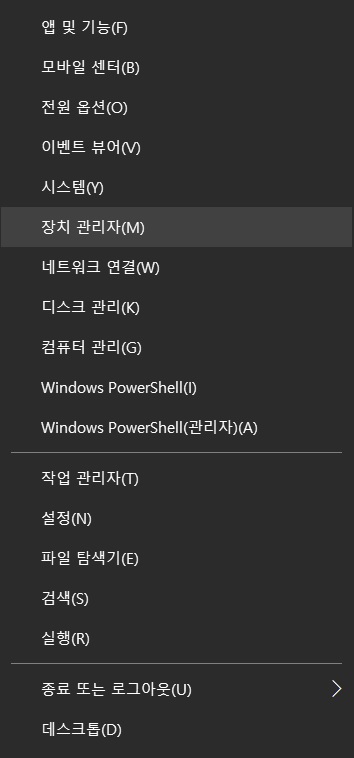①하단 좌측 윈도우 로고 우 클릭하여 장치관리자를 실행합니다.