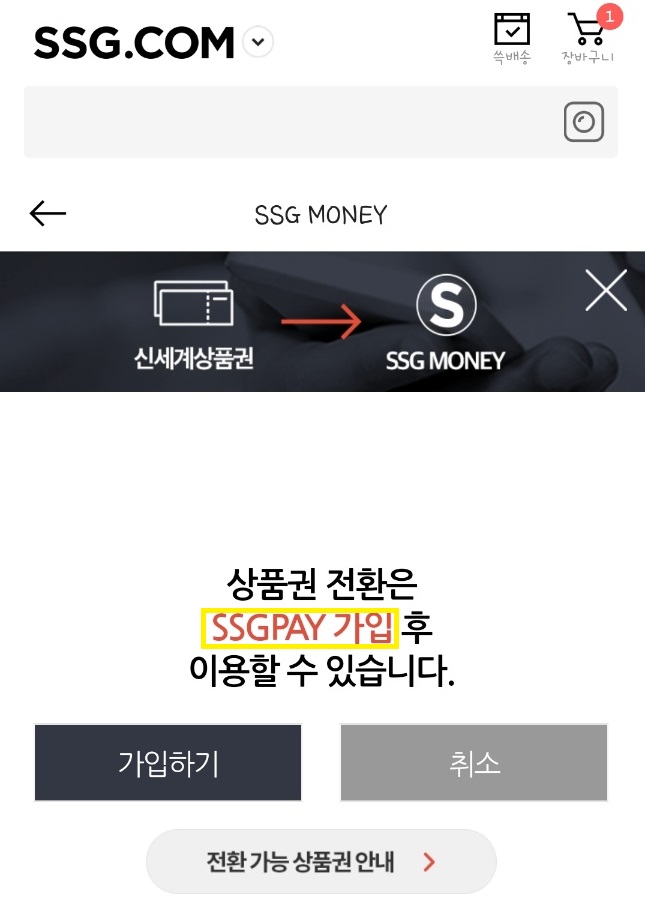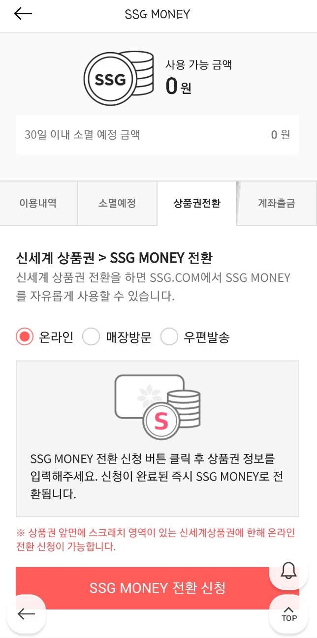 👀신세계 상품권을 온라인 쓱 머니로 전환 신청합니다.