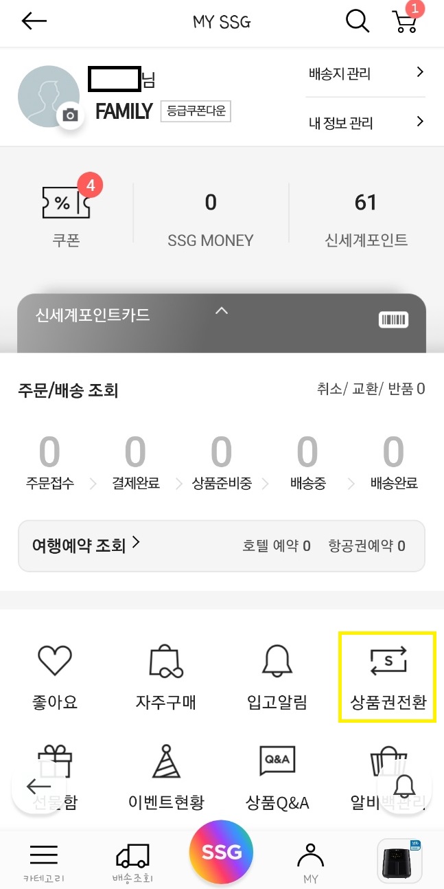 👀마이페이지(MY SSG) → 상품권 전환 클릭!