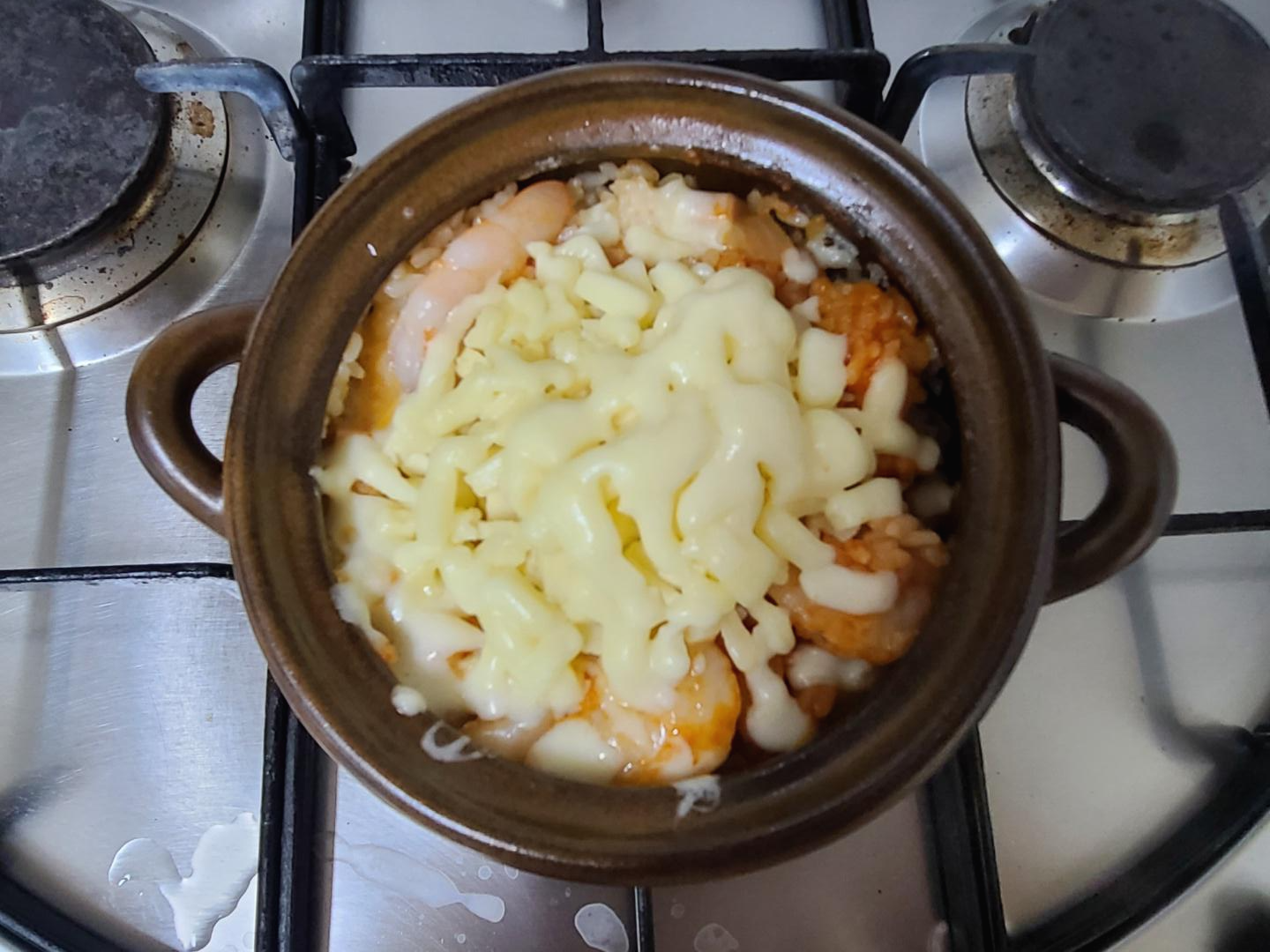 뚝배기 뚜껑을 덮어두고 기다리다보면 맛있는 냄새와 지글지글 소리가 반겨줍니다. 요리장갑이 어디 갔는지 보이지 않아서,, 마른 수건으로 뚜껑을 열어보니 치즈가 맛있게 잘 녹았어요. 지글지글 소리에 군침이 돌아요~