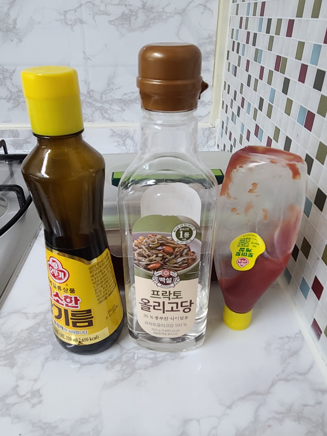 양념 삼총사 준비완료. 고추장, 올리고당, 케찹의 비율을 1:1:1로 넣어주면 돼요. 마지막에 참기름을 뿌려서 마무리~