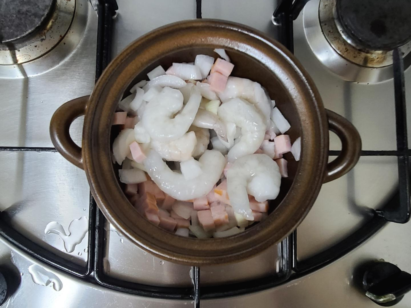 치즈밥의 포인트는 뚝배기죠! 소형 뚝배기를 구입해두니 여러모로 유용하게 활용하고 있어요. 양파와 햄을 볶아줍니다.