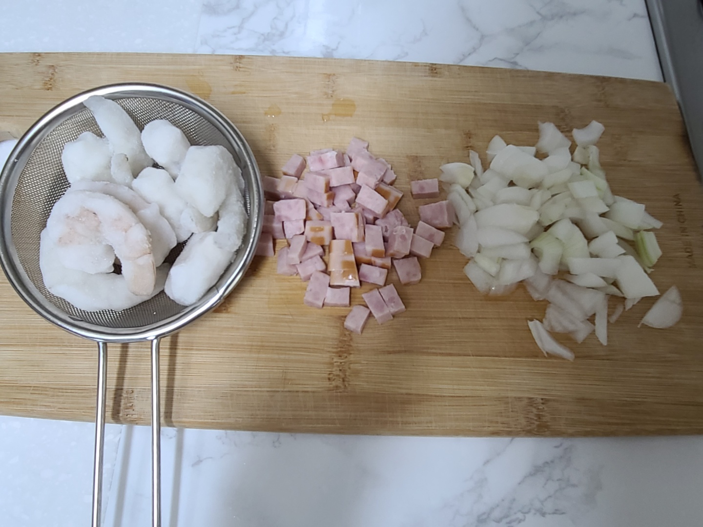 저는 집에 있는 새우, 햄, 양파를 넣어 주었어요. 톡톡 먹는 재미가 있는 옥수수콘을 넣으면 좋지만 아쉽게도 없어서 패스!! 옥수수콘이 있다면 치즈밥 만들때 꼭 넣어주세요. 그 외 참치, 김치 등 개인 취향에 따라 집에 있는 재료로 만들면 됩니다. 냉장고 파먹기 할 때 참 유용해요ㅋㅋㅋ