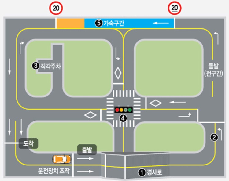학과시험에 합격했다면, 이제 실전 운전연습! 기능시험이 기다리고 있습니다. 기능시험 코스는 어느 시험장이든 동일해요.(각 시험장별로 다소 차이가 있을 수는 있겠지만, 위 사진과 거의 동일하다고 보면 됩니다.) 운전학원에서는 연습한 코스에서 바로 시험을 보기 때문에, 감을 잃지 않을 수 있어요.