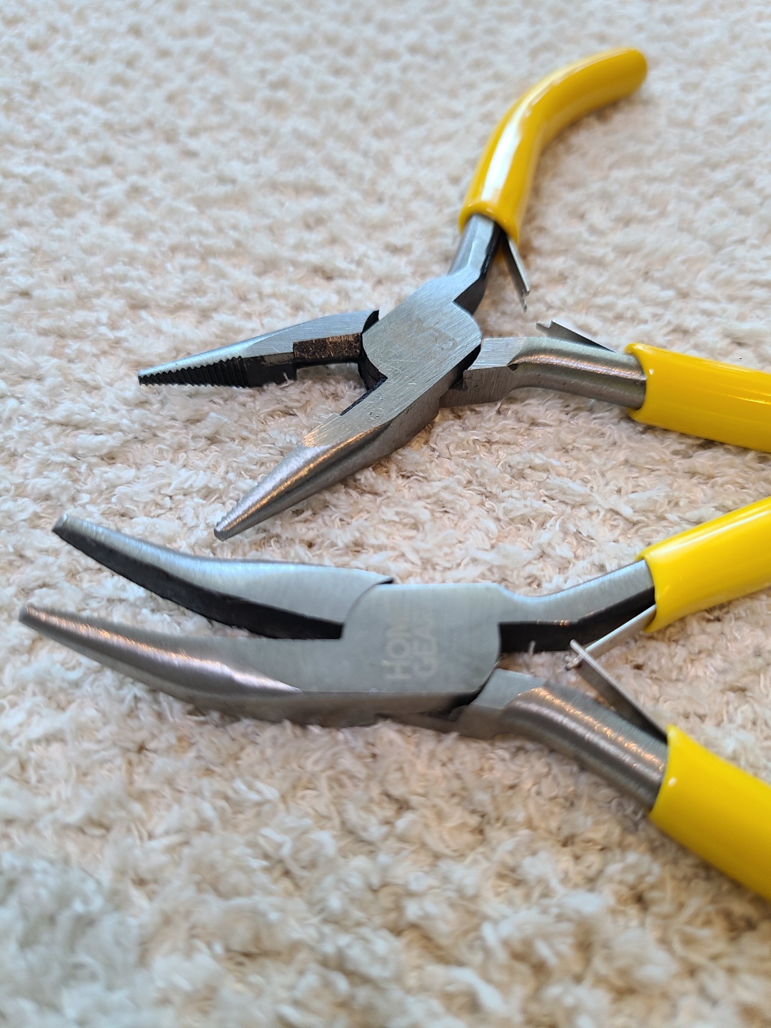 다이소에서 구매한 미니공구 롱노우즈와 벤트노우즈예요. 악세사리 전용 공구들은 가격대가 높은 편인데, 취미생활로 즐기기에는 다이소 공구도 아주 좋아요~ 사진과 같이 다이소 롱노우즈는 물결 무늬가 있고, 벤트노우즈는 단면이 평면으로 되어 있어서 오링을 열고 닫는 용도로는 벤트노우즈, 또는 평집게가 적당합니다. 저희 지역 다이소에는 평집게가 없어서 벤트노우즈로 추가 구매 했어요.