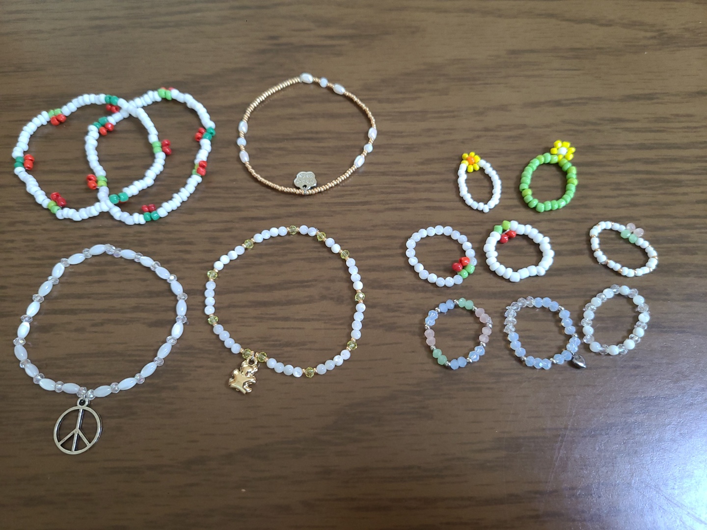 오늘 두 시간동안 만든 결과물이에요~ 친구들이 예쁘다고 했던 앵두 팔찌와 반지를 많이 만들고, 꽃반지도 만들어 보았는데 꽃반지는 실제로 착용하기 어려울 것 같아요ㅋㅋㅋ '귀엽네!' 하고 만족하는 맛으로 보관해야 겠습니다,,