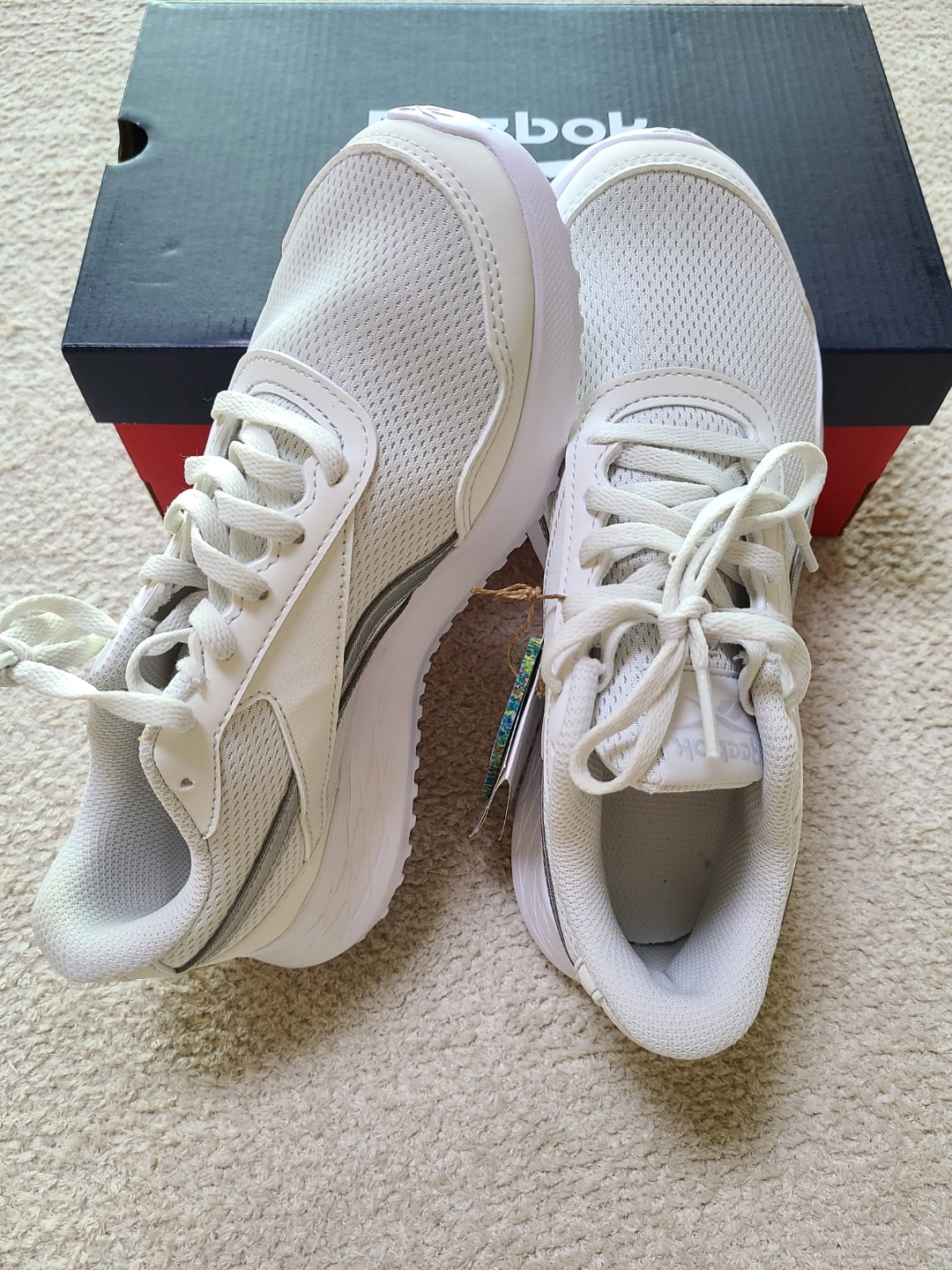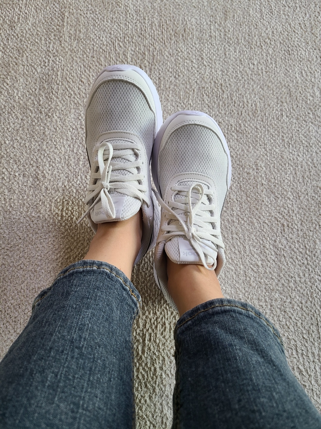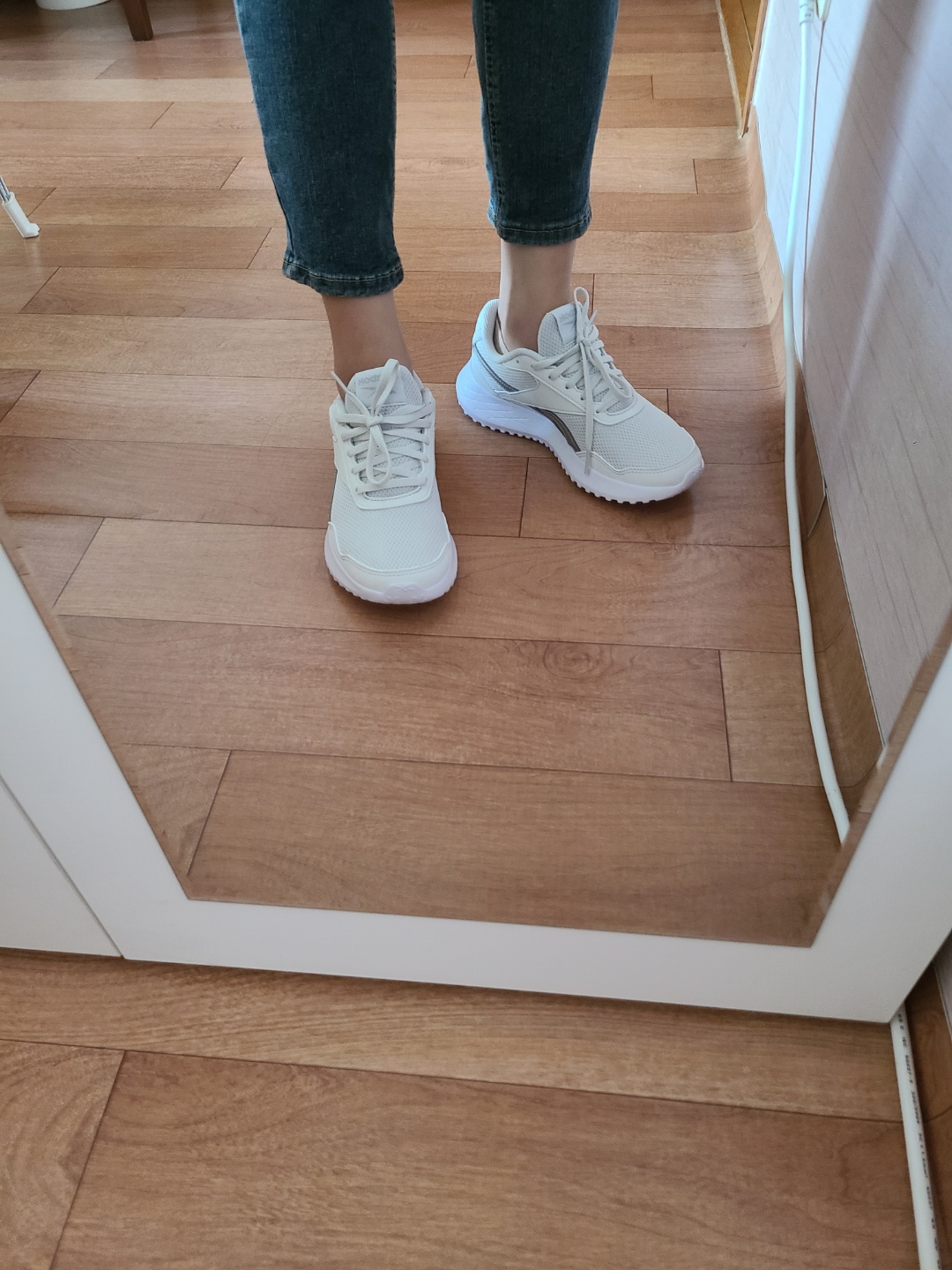 신발끈이 꽉 조여진 상태로 오기 때문에 '조금 작은가?'싶었는데, 발에 맞추어 신발끈을 느슨하게 조절해주니 사이즈가 딱 맞았어요. 군더더기 없이 깔끔한 화이트톤의 리복 런닝화. 청바지, 슬랙스 등등 출근 복장에 무난하게 잘 어울려요~