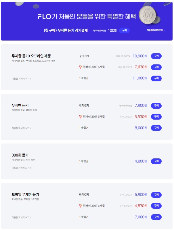 지금까지 주로 통신사 결합형 음원 스트리밍 요금제를 이용해 왔던터라, 따로 알아보려니 생각보다 가격대가 높게 느껴졌어요. 지니, 멜론, 플로 등 통신사 결합 6개월 할인 기간이 지나면 월 7000원에 가까운데 다른 구독 서비스보다 은근 아깝게 느껴집니다. 저는 노래를 그렇게 자주 듣지는 않아서요. 그렇다고 없으면 아쉬운..? 300회 듣기처럼 한정적인 요금제는 또 마음이 가지 않더라구요~