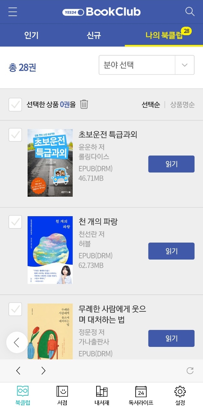 예스24 북클럽 역시 화면 구성이 깔끔하고 트렌드에 따라 책 추천을 해주어서 다양한 장르의 책에 관심을 가지기 좋아요! 저는 주로 '나의 취향저격 ebook'추천 도서나, 인기도서에 관심이 많아요. 요즘은 도서관이 이전처럼 운영을 하기에 도서관에 직접 가서 종이책을 빌려보는 것을 더 선호해요. 그래서 예스24 전자책을 이전처럼 자주 보지는 않는데 갑자기 읽고 싶은 책이 생겼을때 유용하게 활용하고 있답니다. 최근에는 운전면허를 따느라 운전 관련 책을 읽었고, 무례한 사람 때문에 속상한 일이 있어서 관련 도서도 찾아 보았어요.