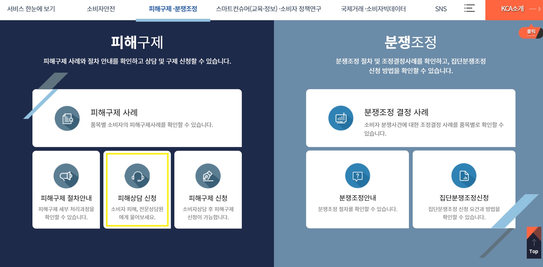 한국소비자원 사이트에 방문 후 메인 페이지에서 스크롤을 내리면 '피해구제, 분쟁조정'페이지가 나와요. '피해상담 신청'을 클릭합니다!