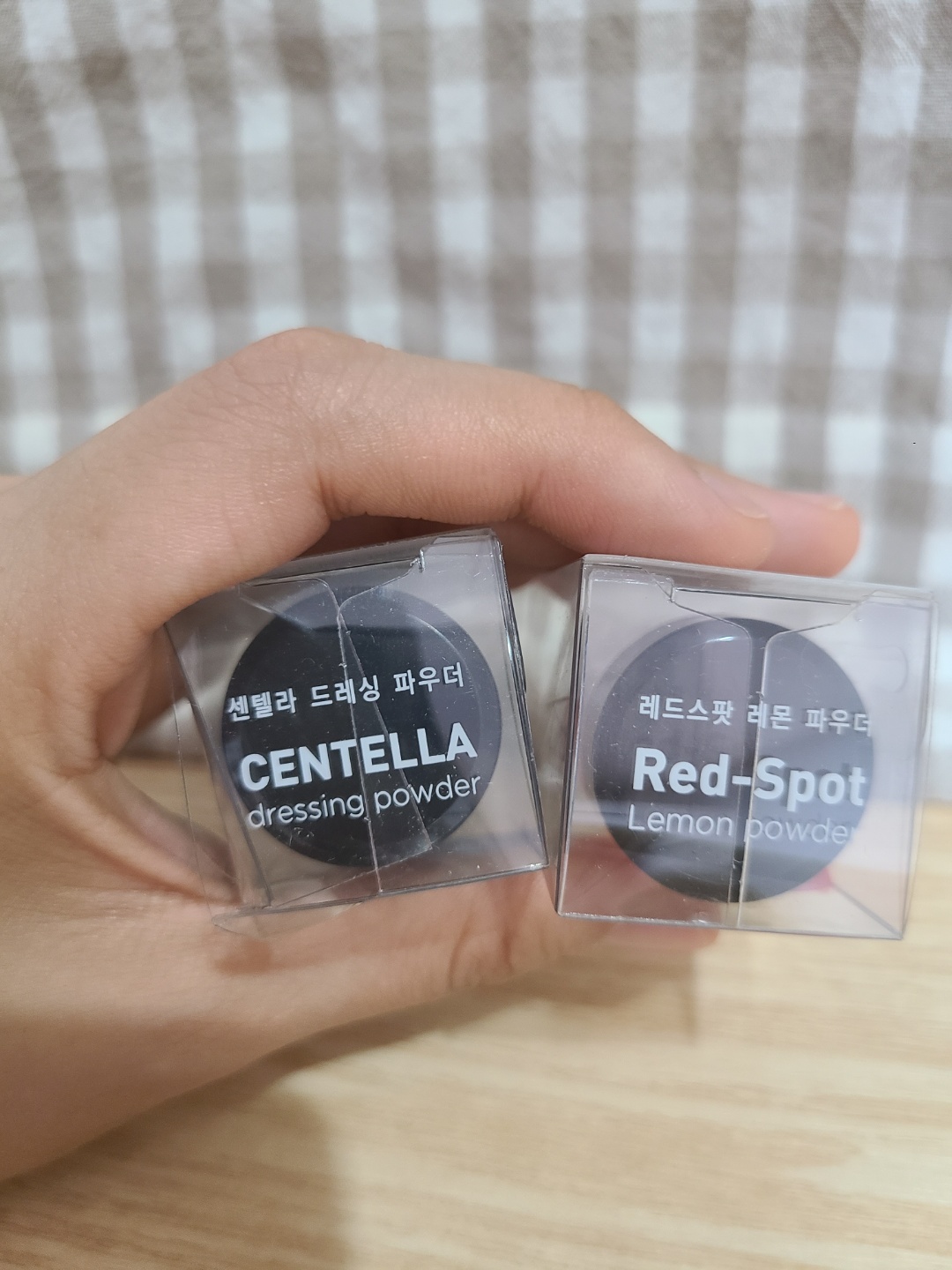 센텔라 드레싱 파우더와 레드스팟 레몬 파우더의 용기와 크기가 동일해서 화장대에 이렇게 사이좋게 붙여두고 사용하니 귀여워요~ 그런데 투명한 용기의 레드스팟 파우더와 달리 센텔라 파우더 용기는 불투명해서 남은 양을 육안으로 확인하기 어려움이 있어요.