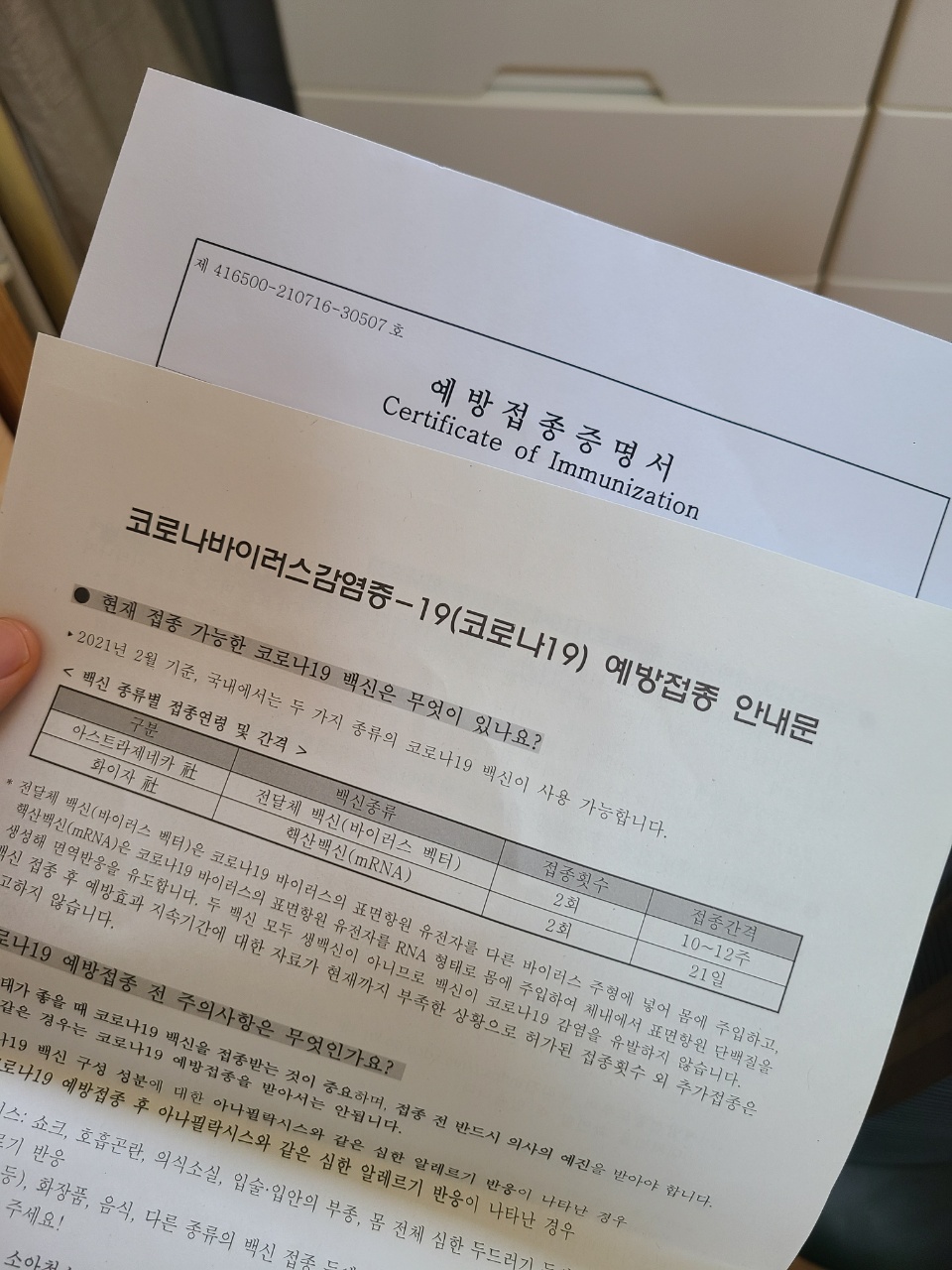 예방접종 증명서를 고이 받아 왔습니다~ 나도 이제 백신접종 완료자! 요즘은 코로나 백신접종을 완료해도 6개월이 지나면 항체 효과가 떨어진다는 말들이 많아서 걱정이지만, 백신 접종 후 예방효과 지속기간에 대해서는 현재까지 자료가 부족한 상황으로 접종횟수 외 추가접종은 권고하지 않는다는 것이 질병관리청 입장입니다. 백신접종 휴가 등등 서로 돕고 배려하며 어렵게 맞은 백신인데 부디 효과가 오래 지속되면 좋겠어요.