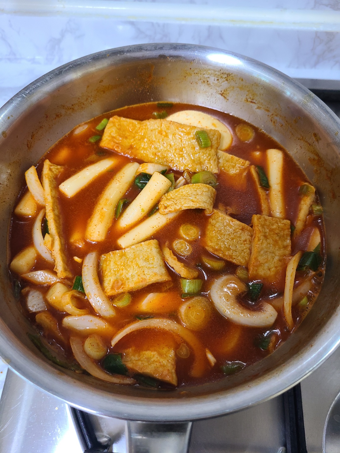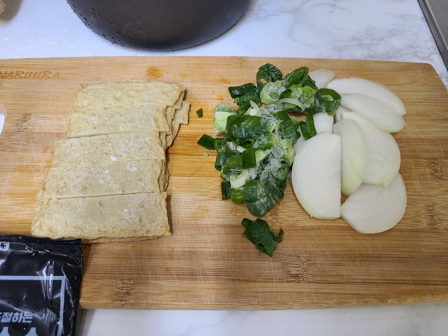 떡을 물에 담구어두고, 떡볶이에 넣을 재료들을 다듬어 줍니다. 사실 밀키트라 특별히 준비할 것이 없어요~ 동봉된 튀김 어묵을 먹기 좋게 썰어주고 취향에 따라 파나 양파 등을 준비합니다. 추억의 떡볶이 느낌을 살리려면 떡과 어묵, 파만 넣은 비주얼이 어울리지만 저는 떡볶이에 들어간 야채를 정말 좋아해서 양파도 함께 넣었어요. 양배추는 집에 없어서 못넣었는데 국물이 넉넉해서 양배추를 넣어도 맛있을 것 같아요.