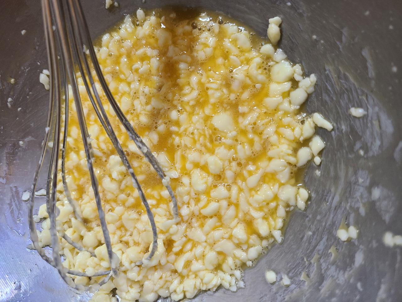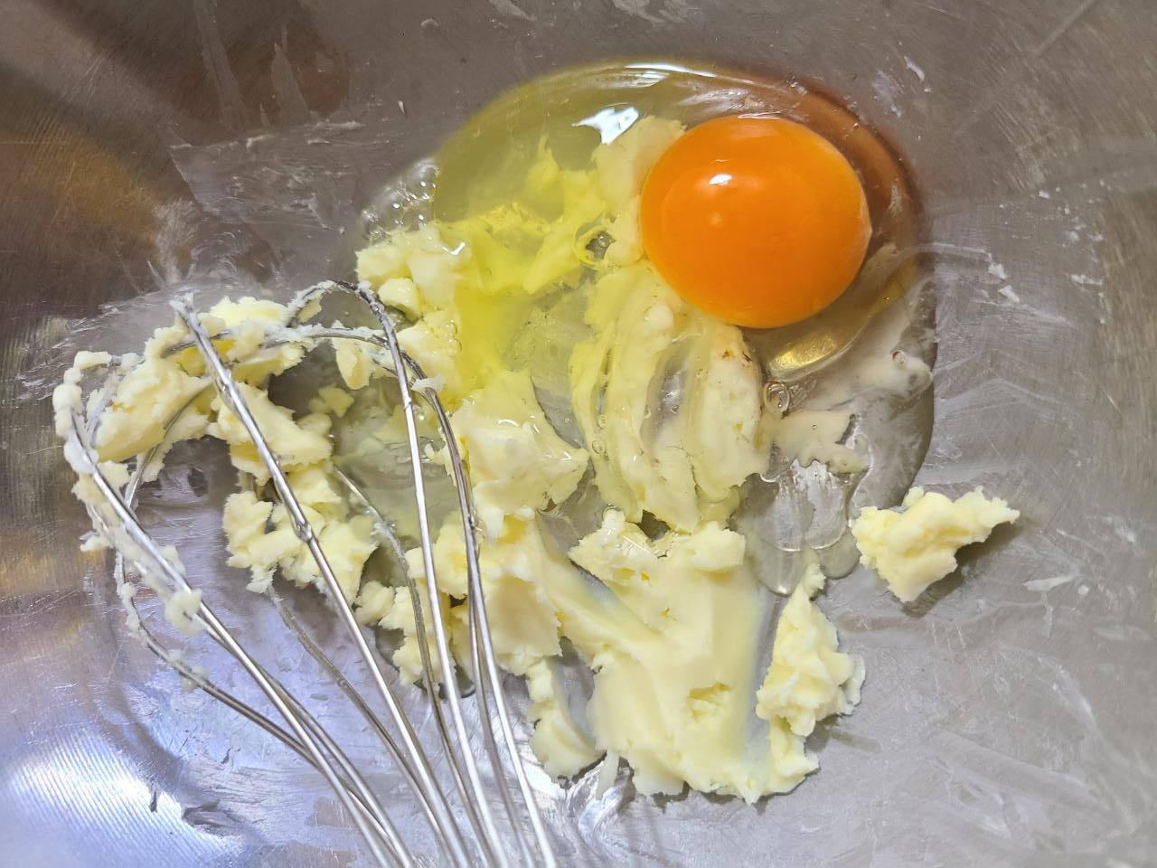 버터를 거품기로 풀어주고 계란과 함께 섞어주어요.
