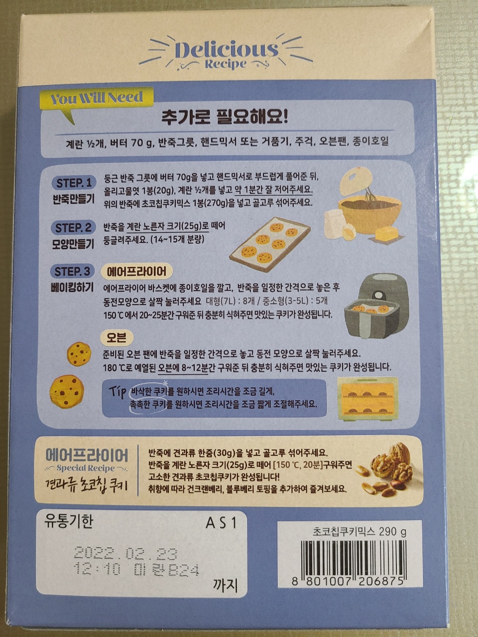 수제쿠키의 촉촉함이 살아 있다는 백설 초코칩쿠키믹스. '에어프라이어로 베이킹을 즐겨보세요'라는 문구에 혹해서 구매해보았어요. 에어프라이어를 구매한 후 아직 베이킹에 도전해본 적이 없어서 궁금했거든요~ 안되는 것이 없는 만능 에어프라이어를 더 일찍 구매할걸 그랬나봐요. 무궁무진한 에어프라이어의 세계!!