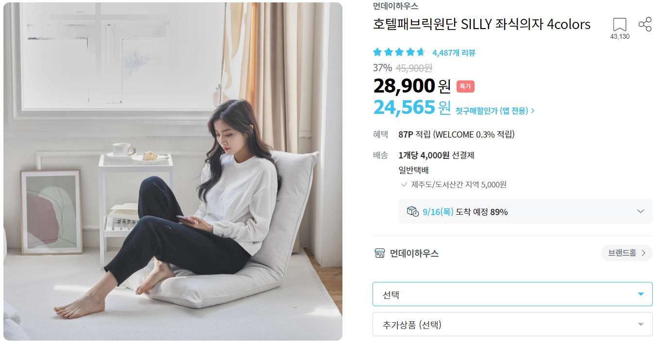 저는 '먼데이하우스'의 좌식의자를 구매했어요. 좌식쇼파 또는 좌식의자 모두 공용되어 부르곤 하므로 블로그에는 좌식쇼파로 명칭할게요! 먼데이하우스 좌식쇼파는 오늘의집에서 28900원에 구매했는데, 현재 첫구매시 약 25000원에 구매 가능하네요. 굿굿. 가구 쇼핑은 역시 오늘의집이 가장 편리한 것 같아요~ 요즘은 무엇을 사든 리뷰를 중요시 보는데, 오늘의집은 다양한 리뷰와 실제 소비자들의 사용 사진을 구경할 수 있어서 제품 비교 및 쇼핑에 도움이 돼요.