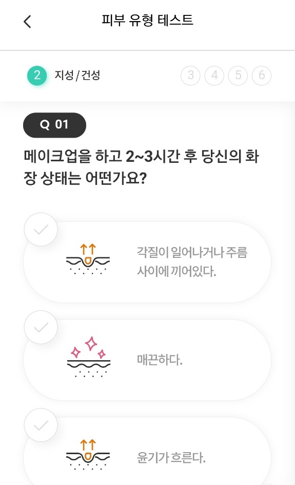 이후 선다형으로 자신의 평소 피부타입에 적합한 항목을 선택합니다. 생각보다 항목이 다양한데 각 항목마다 그림이 있어서 심심하지 않게 금방 끝났어요.