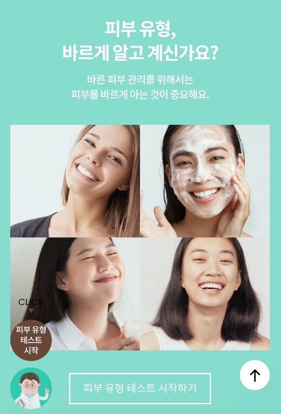모바일, 또는 웹사이트에서 피부진단 테스트를 받을 수 있어요. 로그인만 하면 무료로 진단 결과까지 확인할 수 있습니다. 바른 피부관리를 위해서는 본인의 피부타입을 정확하게 인지하는 것이 중요하다고 해요. 지성이라고 생각했는데 복합성일 수도 있고, 피부유형은 환경적 상황에 따라서도 변화될 수 있으니 현재 피부상태에 적합한 관리를 하는 것이 건강한 피부를 위해서 중요하겠죠.