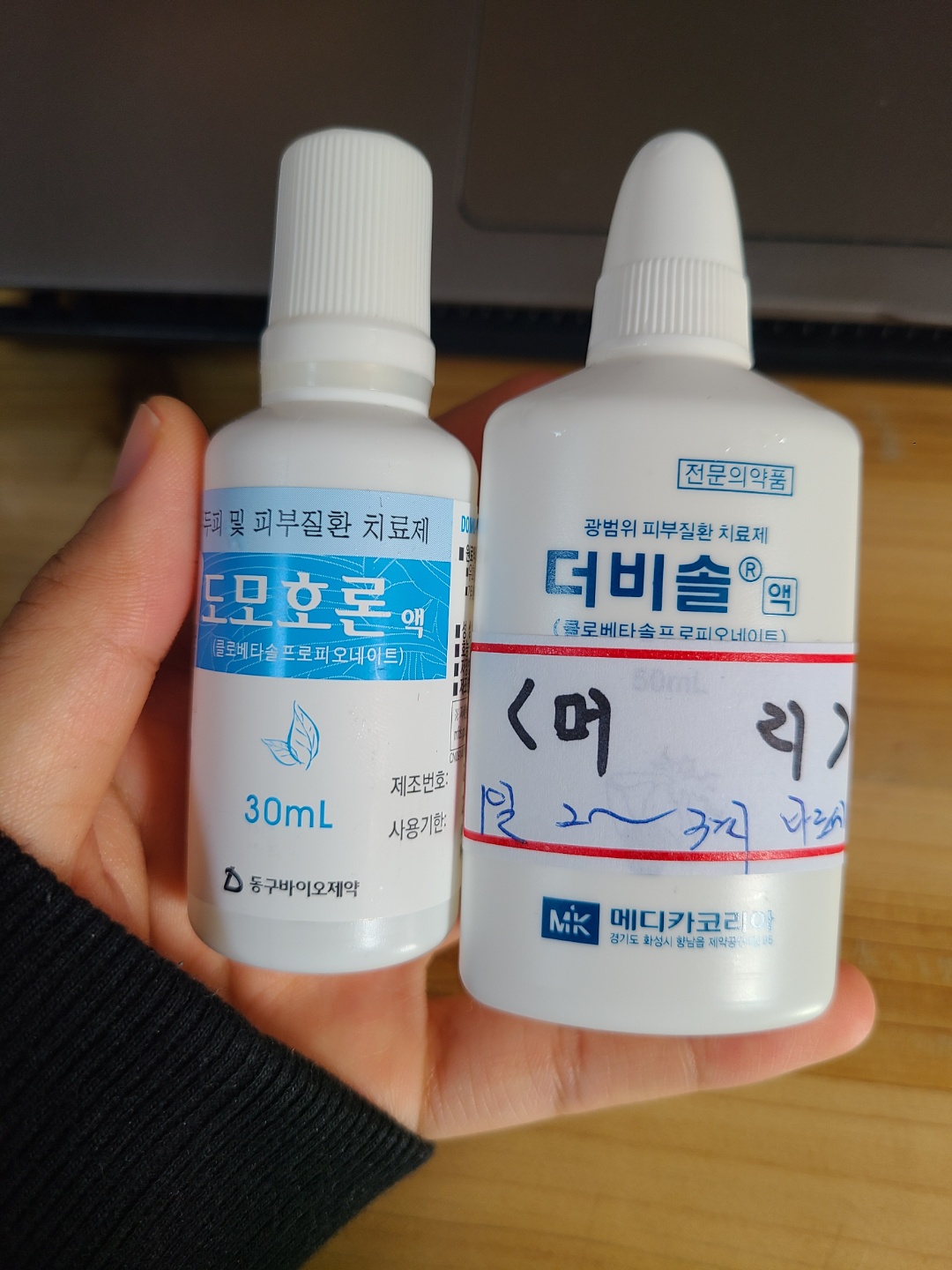 먹는 약 외에 처방받은 바르는 약은 바를 때는 시원한데 단기적으로 증상이 개선되지는 않더라구요. 어쨌든 피부질환은 완치의 개념보다는 장기적 관리가 중요하다는 것을 알게되어 샴푸를 바꾸고 그 후로 신경쓰지 않고 살다보니 점점 괜찮아졌어요.