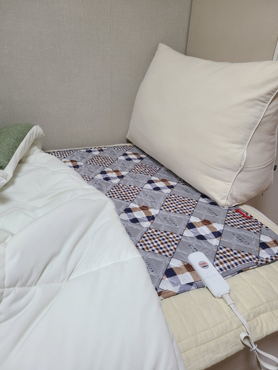 -이전에 사용해왔던 매트는 조절기에서 소리가 나지 않아서 혹시 불량품인가? 하는 마음으로 문의글을 열심히 찾아보다 알게 된건데 이점은 장점이자 단점이 될 수도 있겠다고 생각했어요. 바로 '인체동작감지 자동 온도조절 시스템'입니다. 인체의 동작을 감지하여 한시간동안 움직임이 감지되지 않으면 취침모드로 전환, 이후 다시 한시간동안 움직이지 않으면 자동으로 꺼지는 기능이 있어요. 고요하게 미동 없이 잠드시는 분이라면 따뜻하게 자고 싶어서 구매했다가 자동으로 전원이 내려가 불편해하는 경우도 있는 것 같아요.