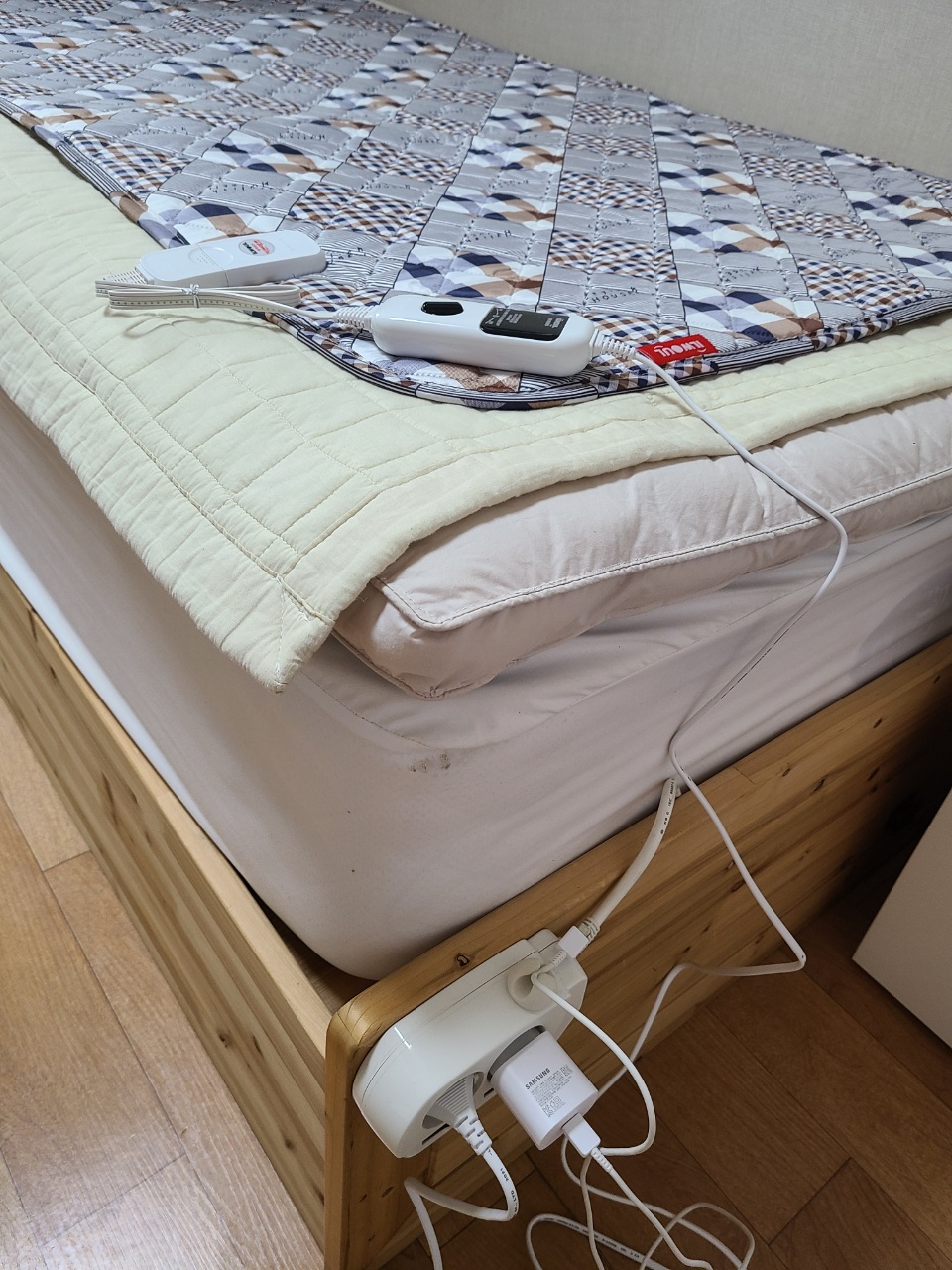 일월 카본매트는 뒤집어서 사용 가능한 디자인이 아니라서 조절기 위치 변경이 안되어 조금 아쉽더라구요~ 조절기가 반대쪽에 있었으면 전선을 깔끔하게 처리할 수 있을텐데 지금은 너저분하죠.😅 오늘 나가는 김에 다이소에서 전선 정리줄 사오려 했는데 잊어버리고 다른 물건만 잔뜩 사왔네요! 또륵