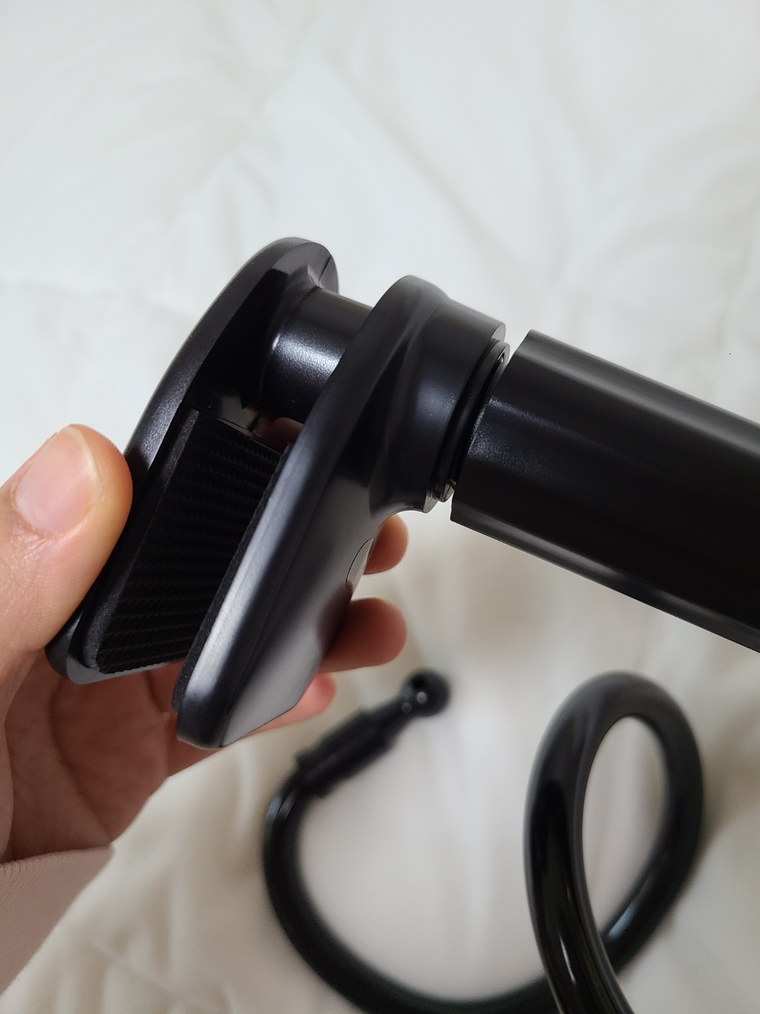단촐한 구성품😊 별도의 설명서가 없어도 조립은 정말 손쉬워요! 그리고 생각보다 거치대 선 부분이 튼튼해서 구부리고 펴는 등 모양의 변화를 주기가 힘들었어요~ 낑낑거리며 힘주어 구부리거나 피어 주어야 해서 사용 각도나 자세를 바꿀 때 어느정도 어려움은 있는데 단단하기 때문에 흔들림은 전혀 없어요. 가성비 거치대의 최대 장점이랄까요?
