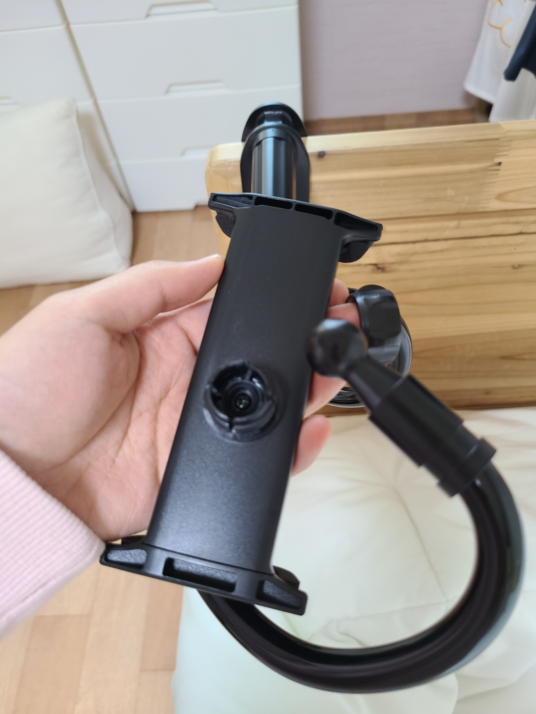 고정 지지대는 수직 고정 방식이라 고정할 수 있는 충분한 깊이의 사물이 필요해요. 연결고리를 돌리고 끼우는 방식으로 고정하여 단단하고 안전하게 고정이 가능했어요~
