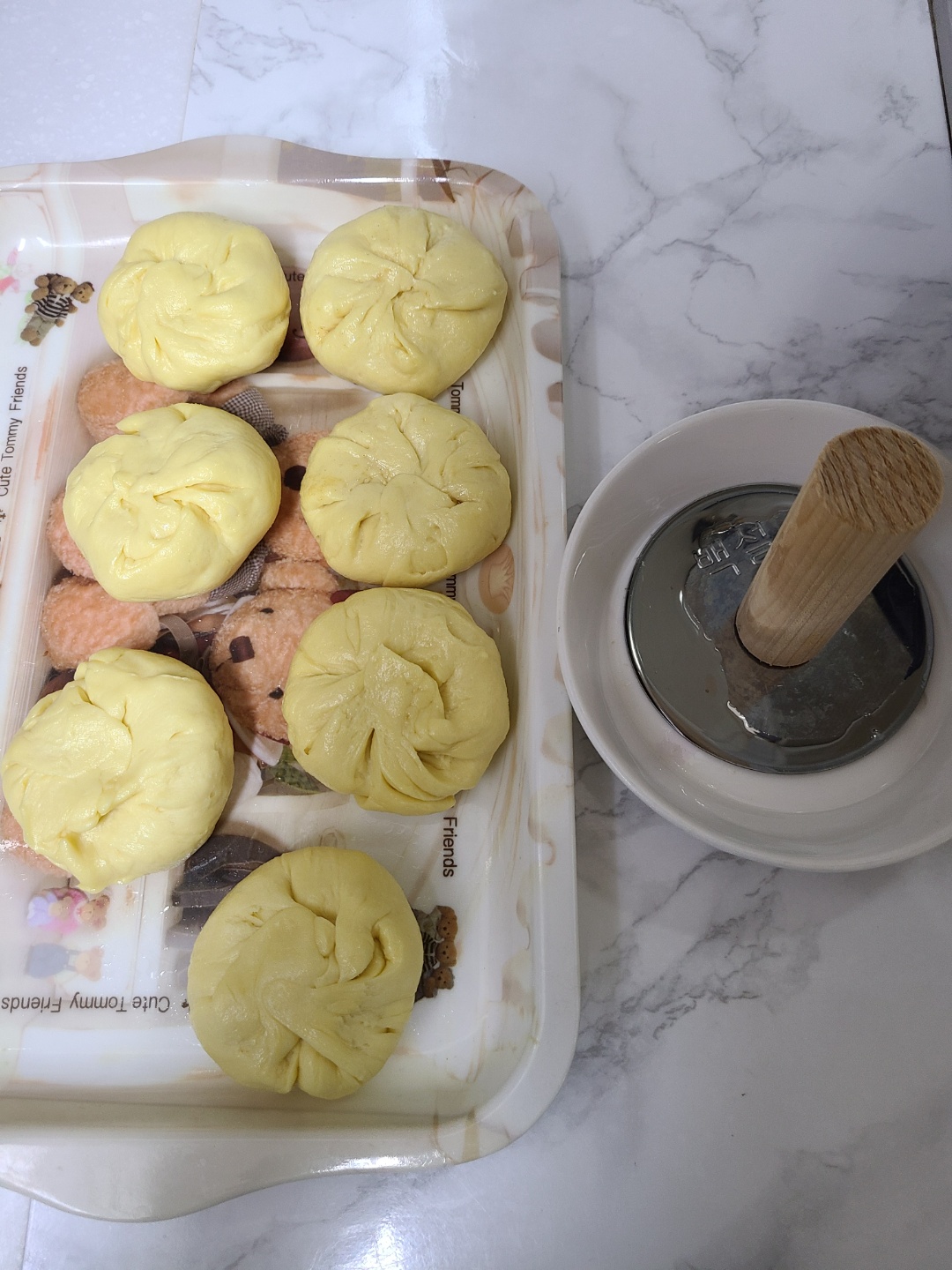 기다리는 시간동안 이것저것 도구를 꺼내서 준비해두었어요. 둥글둥글 뭉친 호떡 반죽을 올려둘 쟁반에는 기름을 발라 준비했어요. 잼믹스는 쏙쏙 넣기 쉽되록 볼에 담고 티스푼을 준비합니다. 뒤집개 역시 받침 그릇을 대어 이제 준비는 끝!