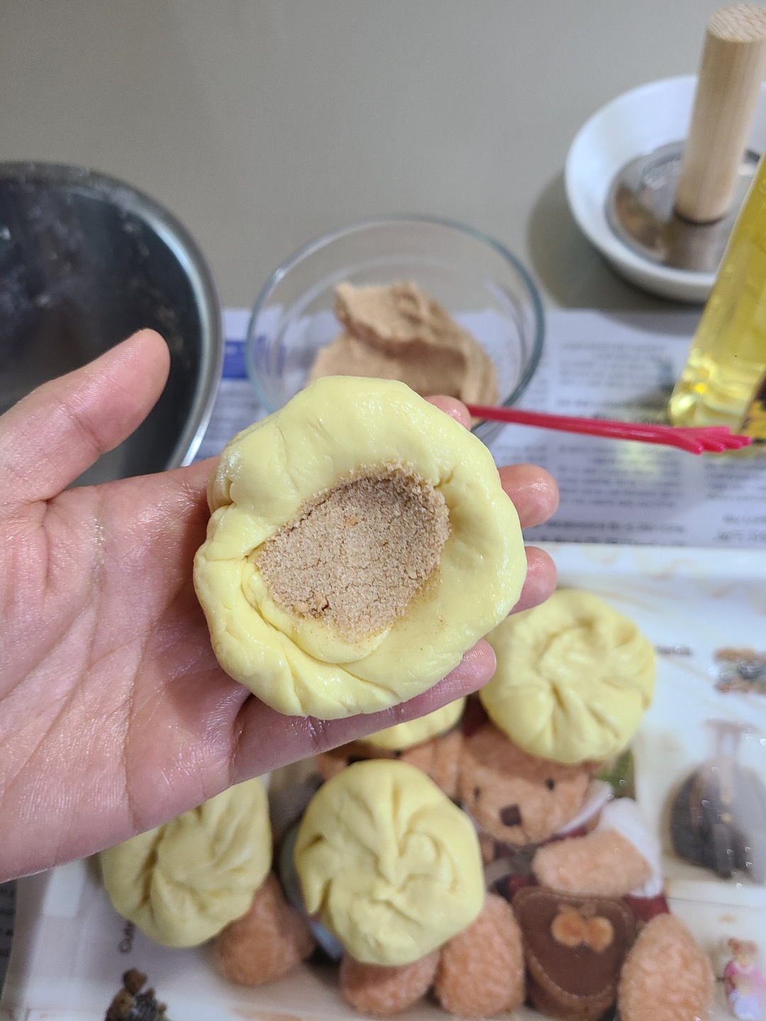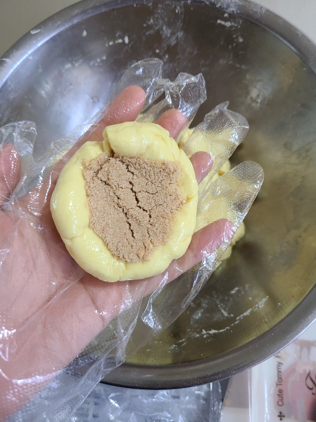 처음에는 손에 기름이 묻는 것이 싫어서 장갑을 끼고 하다가, 장갑이 계속 밀려 맨손으로 만들어 줍니다. 집에서 만드는 호떡이니 호떡 속을 알차게 두, 세스푼씩 넣어 주었어요~ 둥글게 뭉쳐둔 호떡 반죽을 엄지 손가락으로 깊게 누르고 잼믹스를 넣고 누르고 또 넣는 과정을 반복합니다. 잼믹스를 듬뿍 넣은 후 끝쪽 반죽을 늘려 입구를 막아 주었어요!