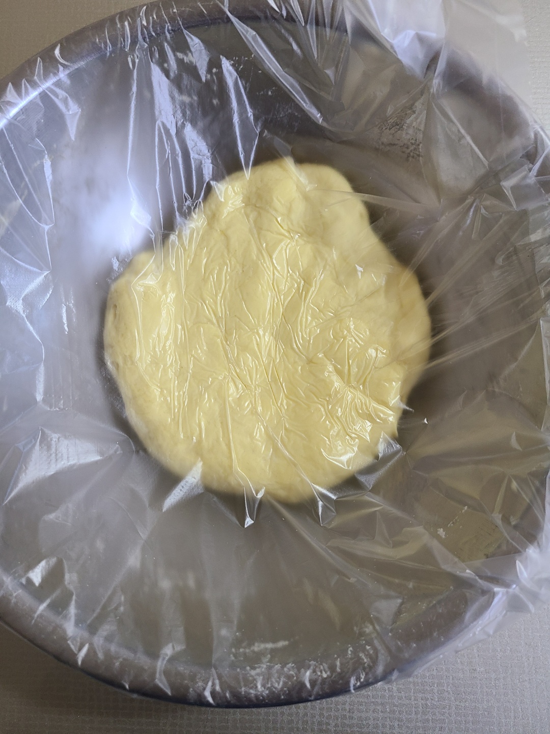 반죽이 완성된 후, 비닐을 덮고 실온에 10분 정도 발효했어요. 프라이팬에 조리시 별도의 발효과정은 생략해도 괜찮은데, 더 부드럽고 쫄깃해지라고 잠시 기다렸답니다~