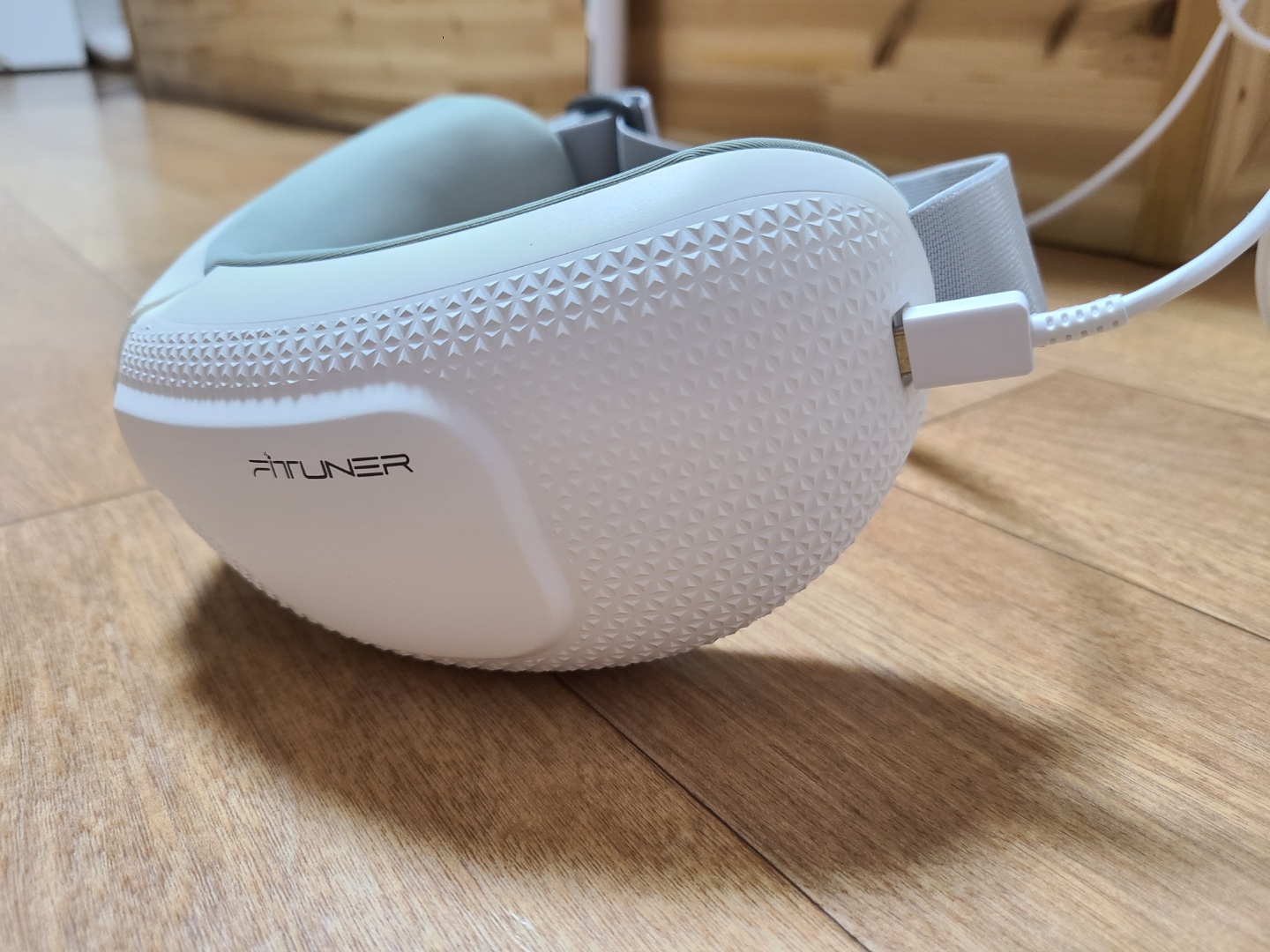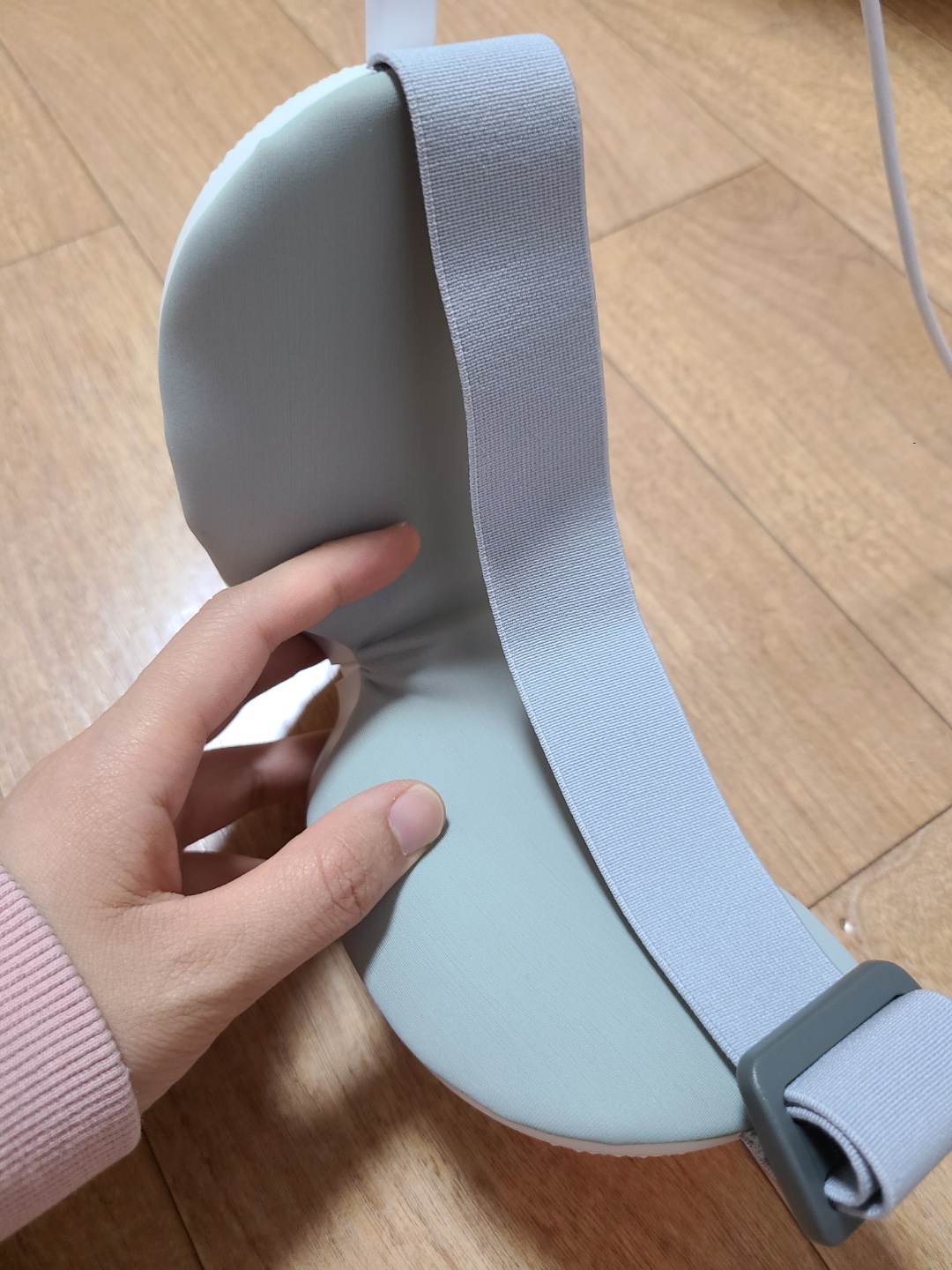 구성품은 매우 심플해요~ 간단한 설명서, 충전 케이블, 마사지기가 동봉되어 있습니다. 마사지기 자체가 폴딩형 디자인이라 쫙 펴진 상태로 열리진 않더라구요~ 스트랩은 길이조절이 가능해서 개인 두상에 따라 맞추어 사용하면 되서 편리했어요. 누워서 10분~15분 가량 기계를 사용할 때 코가 눌리면 답답할텐데 핏튜너 마사지기는 u자형 코받침 디자인이라 크게 불편하지는 않았어요. 다만 제 얼굴형에는 기계 모양 자체가 알맞게 밀착되는 느낌이 아니라 아쉬웠어요. 콧등 양옆의 부분이 살짝 뜬 느낌이라 온열기능이 눈 전체적으로 퍼지기는 어려운 느낌이랄까요? 이 부분은 개인의 얼굴형에 따라 다를 것 같습니다~