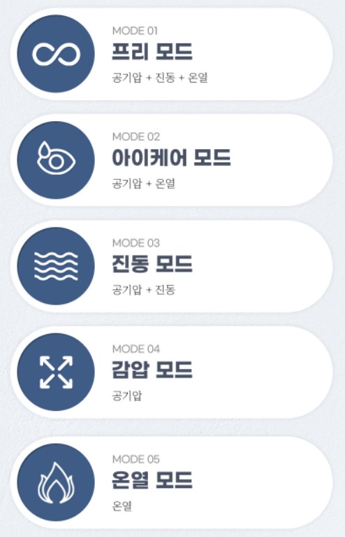핏튜너 눈마사지기는 무려 다섯가지 조합으로 사용가능해요! 5개의 모드, 5단계의 조절이 가능하니 가족이 함께 사용하기 좋은 제품!! 저는 주로 기본 모드인 프리모드를 사용하고, 엄마는 온열모드를 종종 사용하시네요. 큰 동그라미를 한번씩 누를때마다 모드를 변경할 수 있습니다.