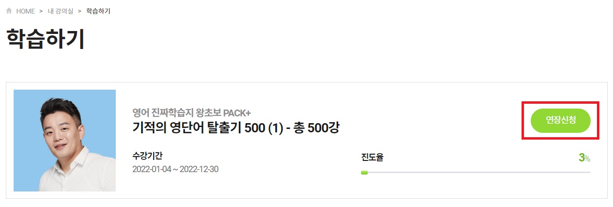 강의 목록 펼쳐보기 이후 '학습하기'에서 연장신청이 가능합니다. 남은 강의들이 많은데 진도율이 0%🤣 반성반성..