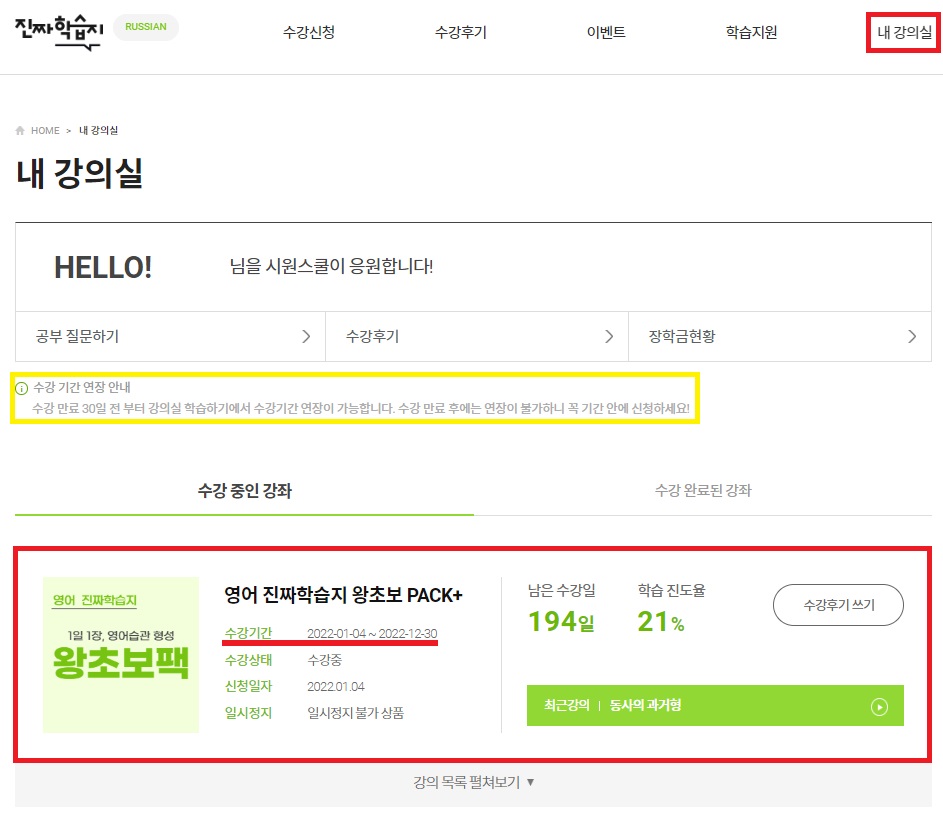 시원스쿨 진짜학습지는 나름 최근에 출시되었기 때문에 저처럼 무료연장 방법이 궁금하신 분들이 계실 것 같아요. 강의 무료연장 방법이 아주아주 쉽고 간단하니 진짜학습지 수강생 분들 꼭 잊지말고 연장신청하시기 바래요~😊