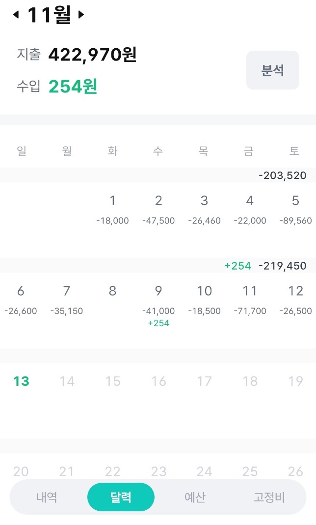 20대 후반 직장인의 현실 가계부.😱😱 2주가량 약 40만원의 소비를 했네요. 한참 절약을 실천할 때는 일주일 용돈을 10만원으로 잡고 생활하여 한달 용돈 예산을 40에 맞춰 두었어요. 2주만에 예산 초과?! 11월은 그나마 양호합니다. 지난 기록들을 보고 정말 깜짝 놀랐거든요.