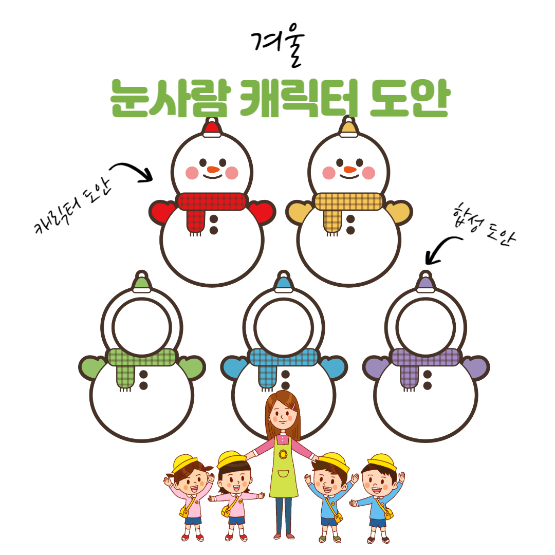눈사람 일러스트. 눈사람 캐릭터 합성 도안은 사진과 같은 구성의 ppt로 공유해드립니다. 합성 도안에는 사진을 넣을 수 있는 도형을 준비해두었으니 그림 채우기로 아이들 얼굴을 넣어주시면 됩니다.